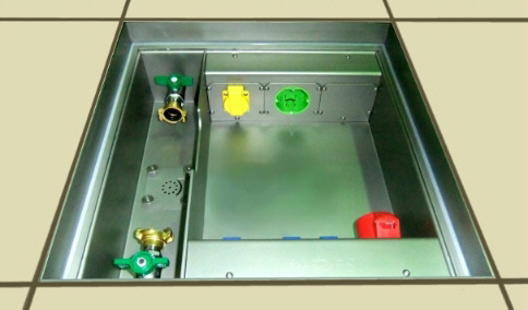 Bodentanks sind bodenbündig im Estrich eingelassen und bieten dadurch unauffällig und verkehrssicher die erforderliche Versorgung größerer Flächen mit Energie, Daten, Wasser und anderen Medien.